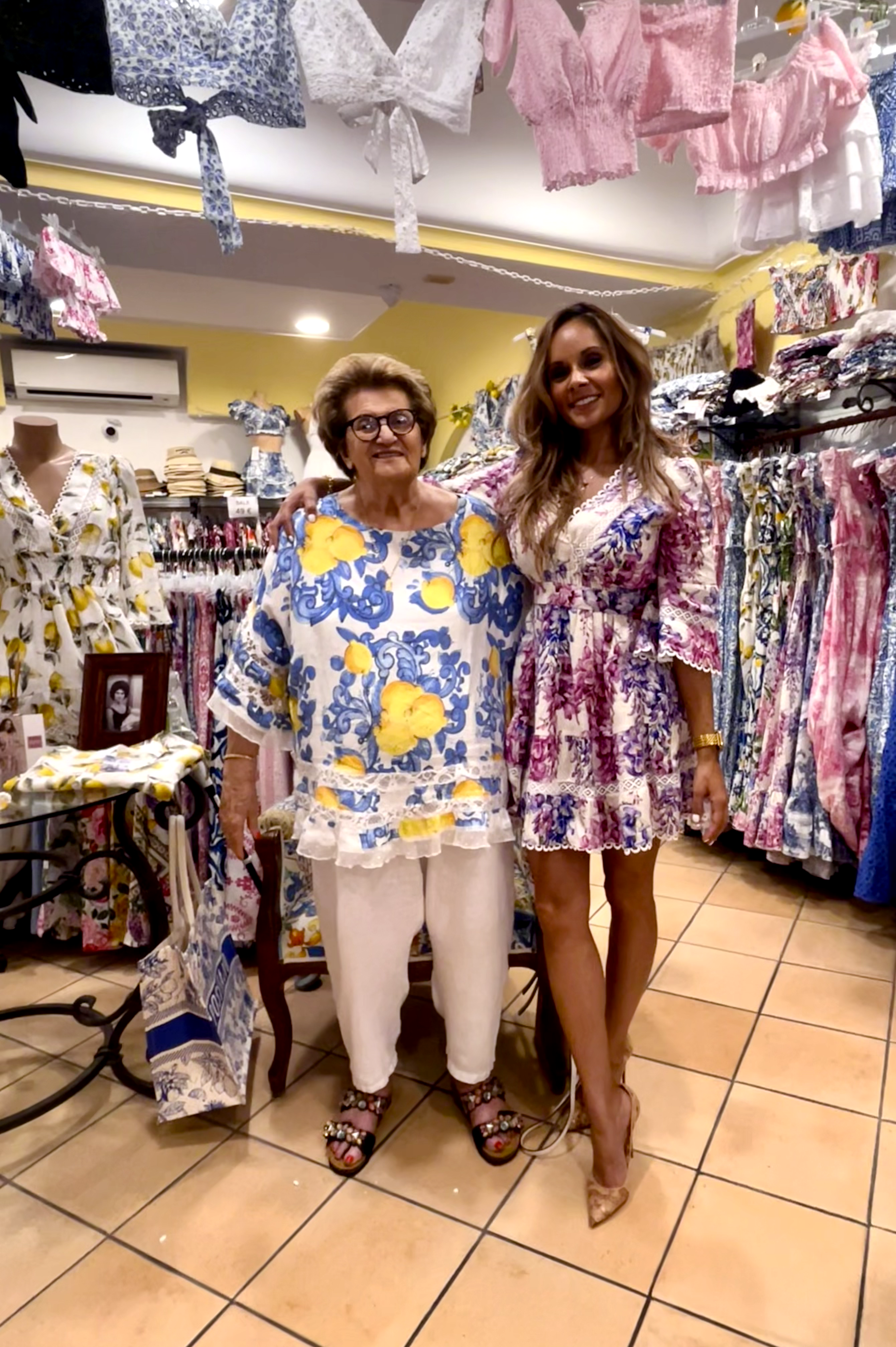 Our founder (wearing the Pink Wisteria Veleno dress) photographed with Italian Designer Luisa Positano, in Positano, Italy. July 2024.